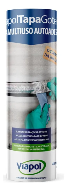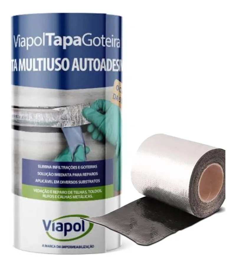 Fita Manta Asfáltica Autoadesiva Multiuso Telhado 45cm x 10m * Manta Asfáltica Autoadesiva Multiuso VIAPOL * Super resistente, não rasga nas laterais e alta durabilidade * Muito utilizada em reparos telhas Amianto, Fibrocimento, Cerâmica, Zinco, Polietileno Fita Manta Asfáltica Multiuso é uma fita impermeável auto-adesiva composta de uma camada de adesivo asfáltico, recoberta com uma lâmina de alumínio flexível e protegida por um filme plástico. Material de fácil aplicação que proporcionando solução imediata em reparos, goteiras e infiltrações. VANTAGENS – Aplicação rápida e fácil. – Impermeável e resistente à água. – Boa resistência aos raios solares. – Flexível. – Aderência na maioria dos materiais utilizados na construção civil, como concreto, argamassa, tijolos, telhas, alumínio, etc. – Não necessita de ferramentas especiais para a aplicação.